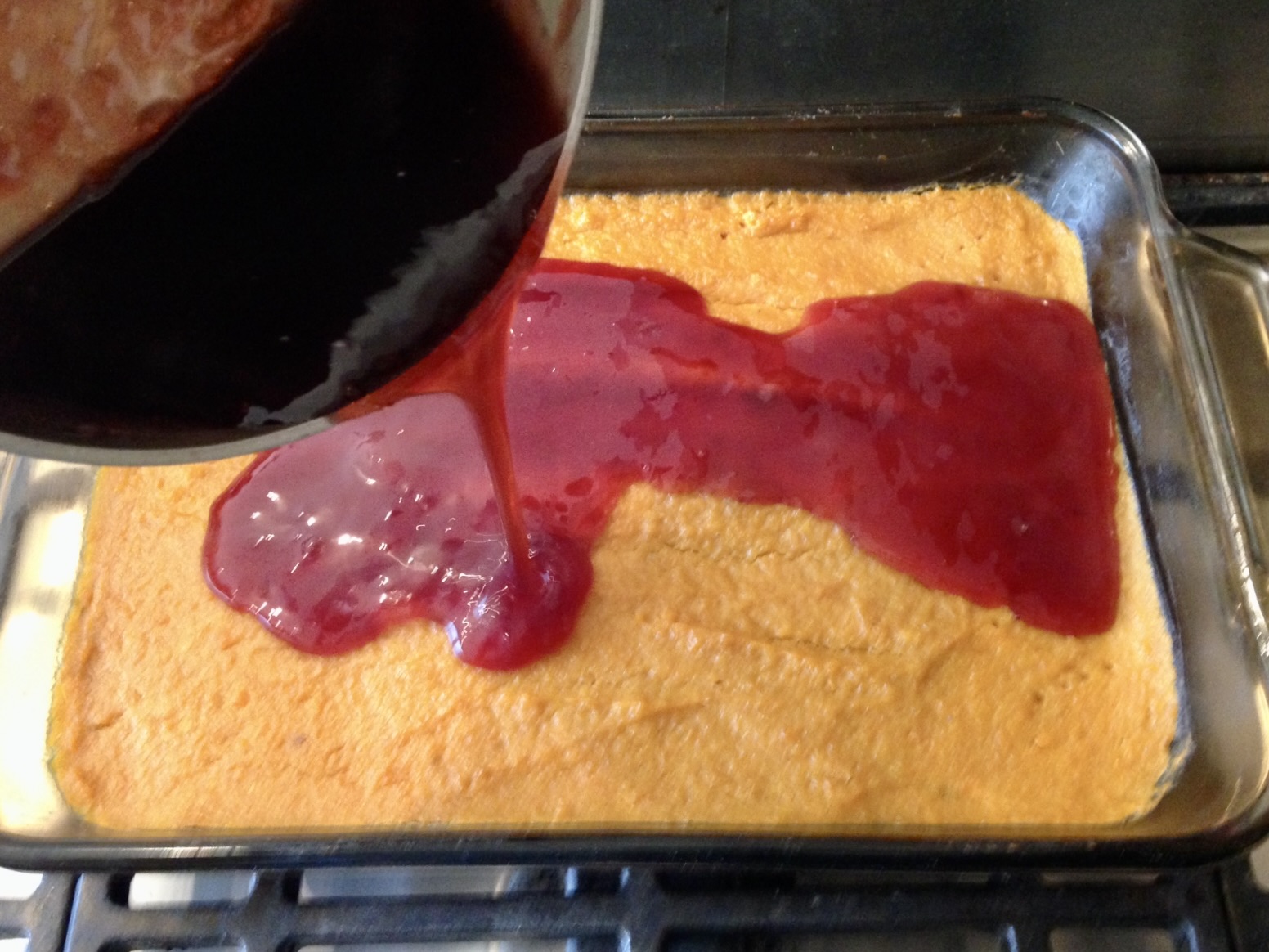 1. Use a spatula and spread the cranberry pudding leaving about a 1/2 to 1 inch of cream cheese filling uncovered