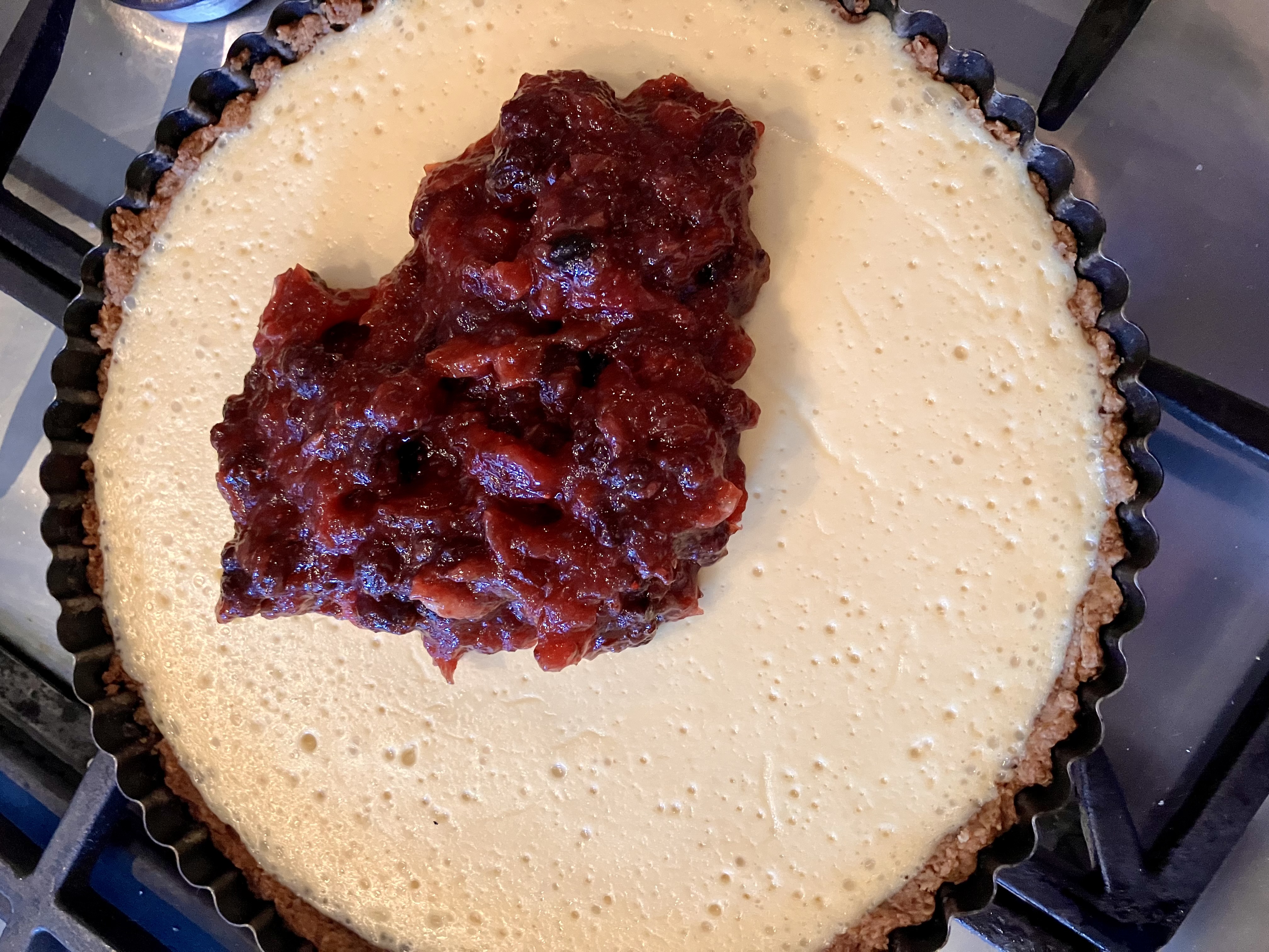 ASSEMBLE THE TARTIf your cranberry pudding is frozen or refrigerated, warm in a pot or microwave just enough so it becomes spreadable, no need to heat through.