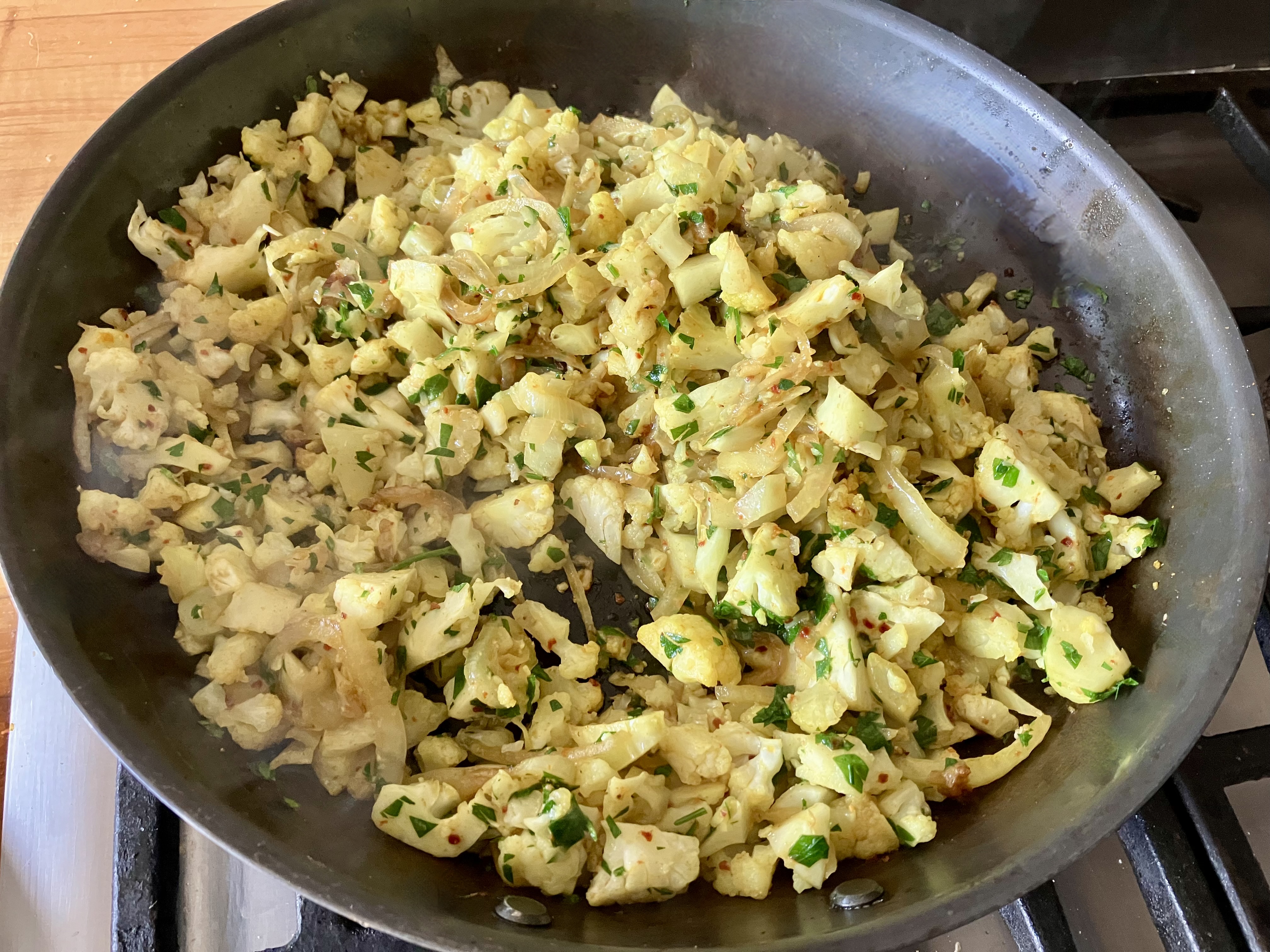 - Add 1/4 cup olive oil to a medium [10 inch] oven-proof skillet along with the onions, garlic, cauliflower, salt, pepper, cumin, turmeric, and chili powder