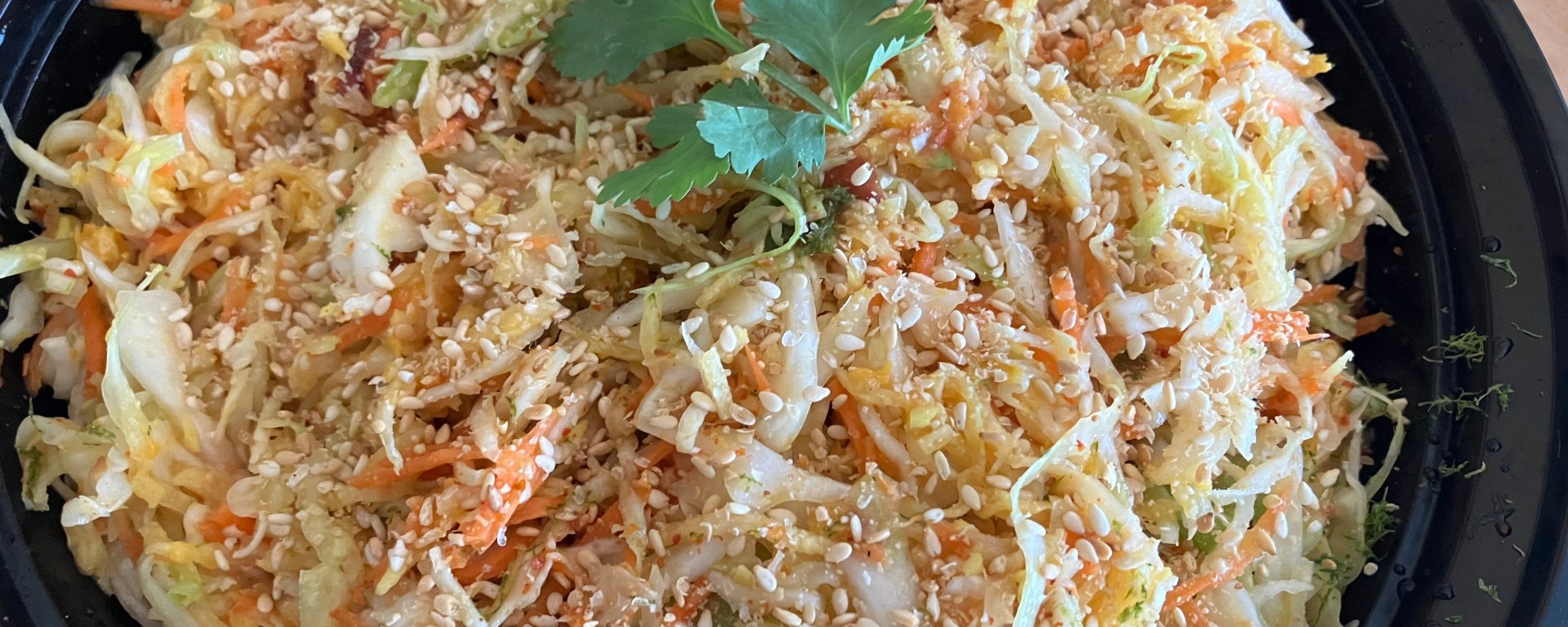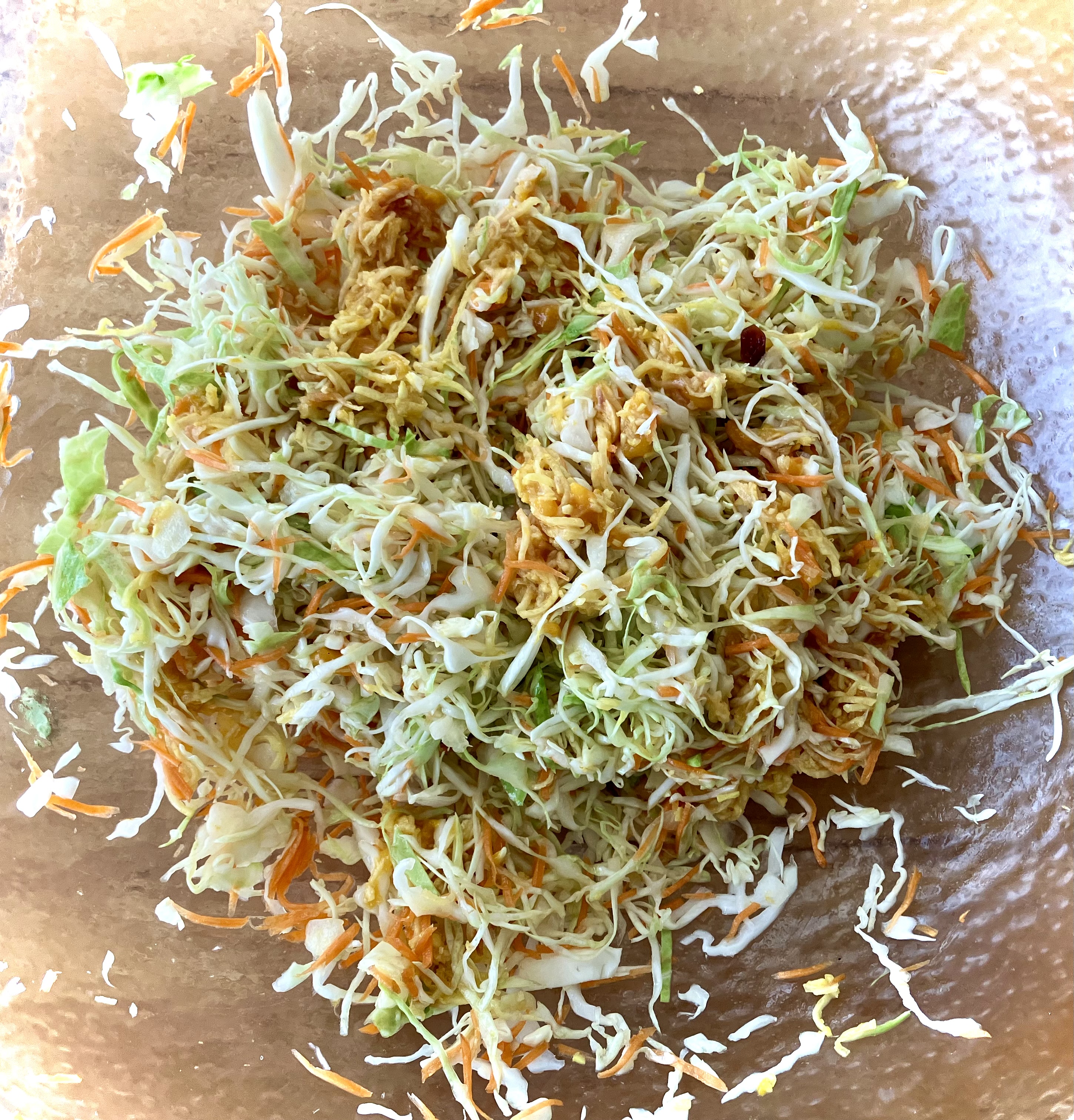 INSTRUCTIONS: I like to press the cabbage with the salt to soften and infuse with seasoning. Toss the shredded cabbage with salt and place in a wide shallow bowl, then place a plate on top and a gallon of water or other weight for about an hour.