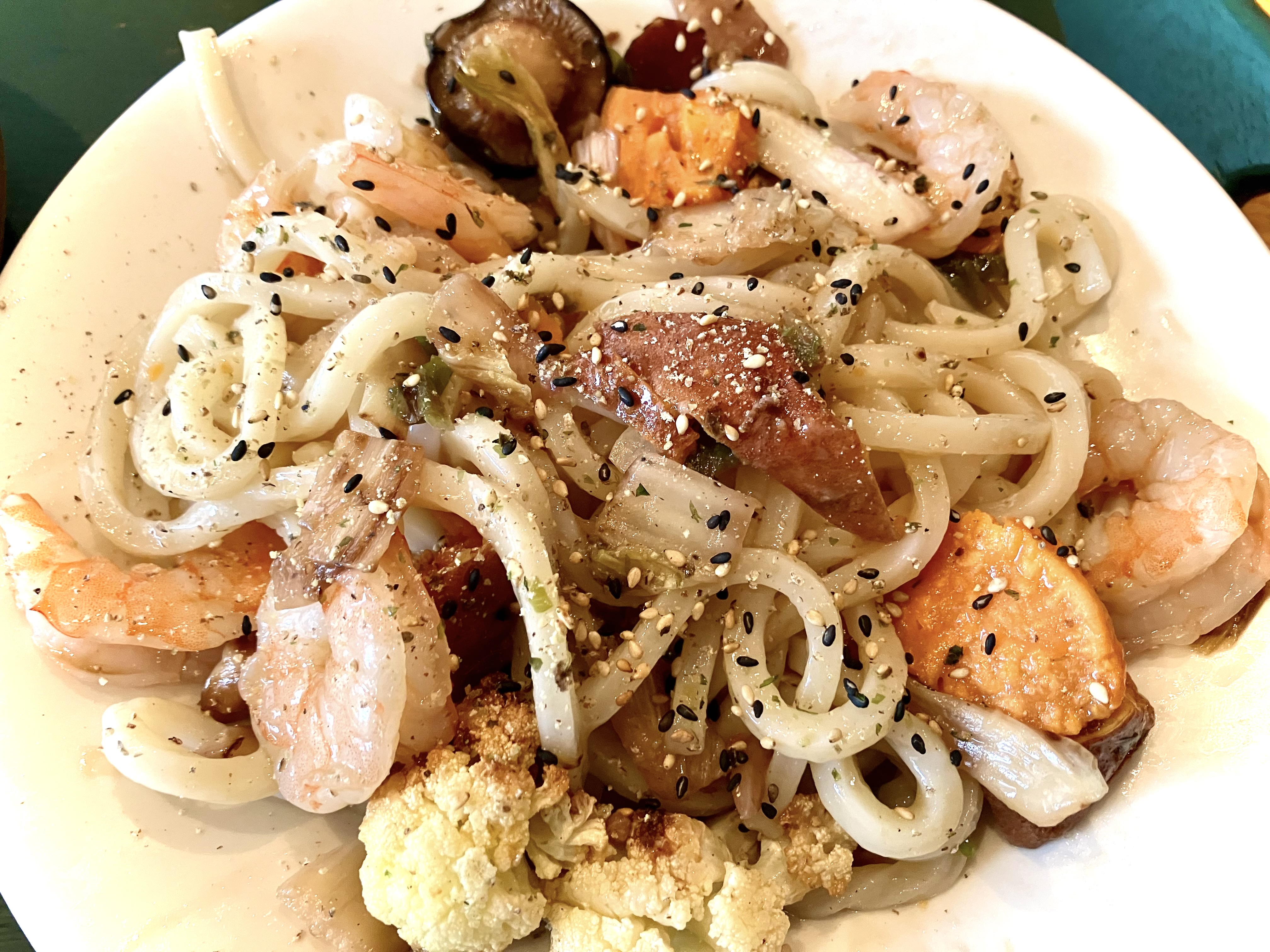 Left: With thick udon noodles, cauliflower, sweet potato Right: With pork and mushrooms