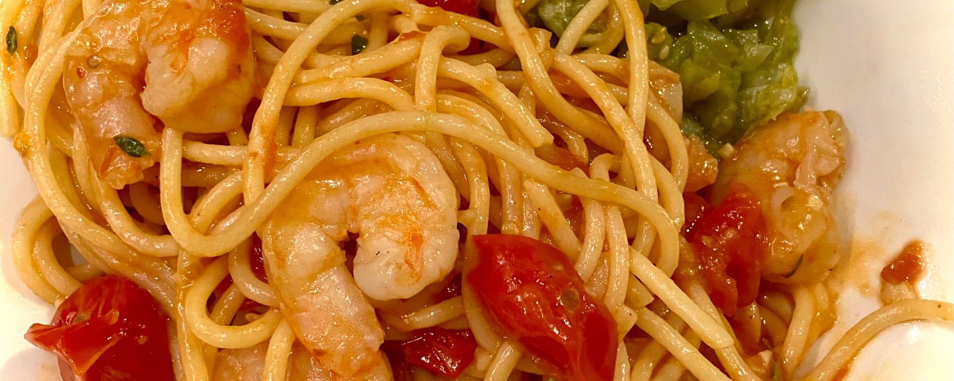 Here are two versions of shrimp pasta both bathed in olive oil, butter, and wine. For the duet I’m breaking tradition by adding grape tomatoes—it’s unanticipated joy!