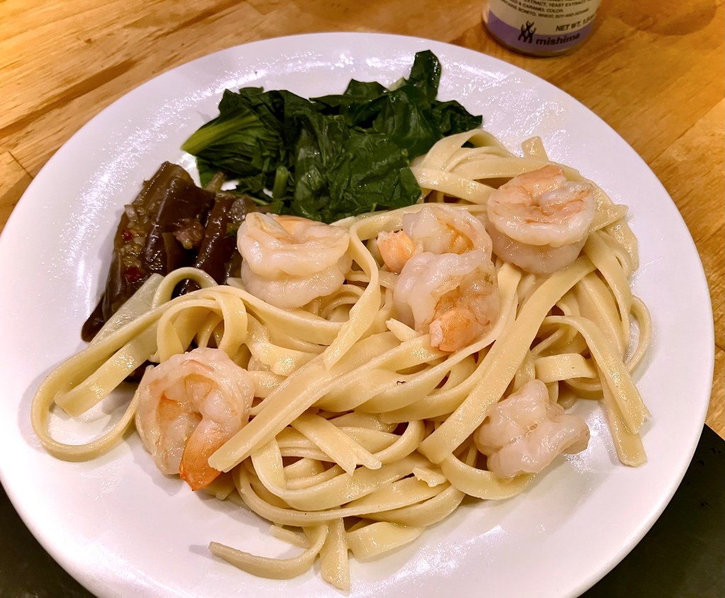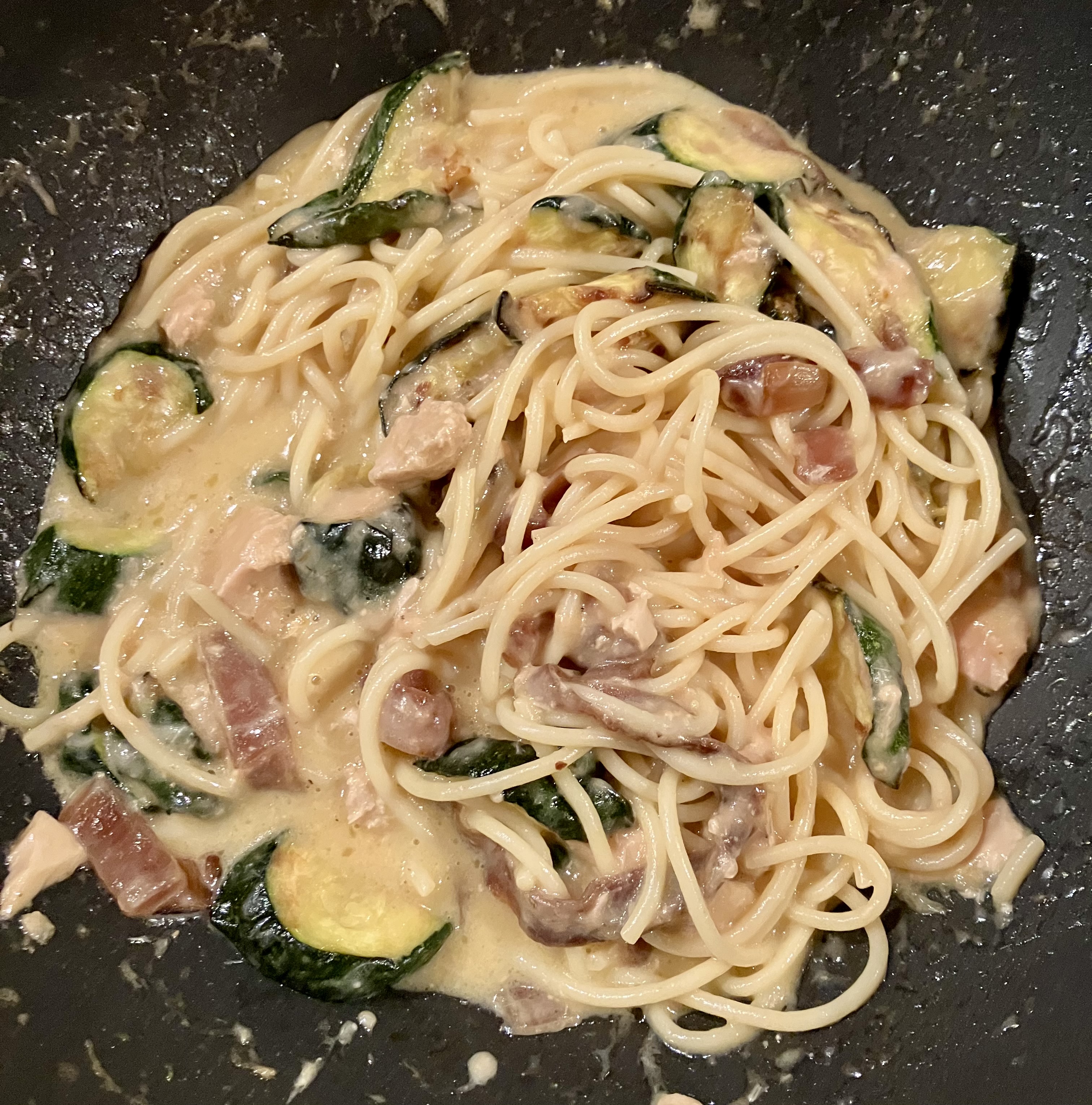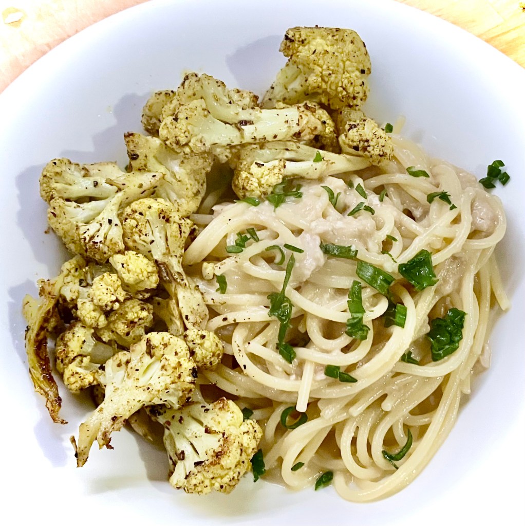 I’m love to break away from red sauced pasta, so whenever I spy a white sauce, I’m ready to test. This dish is a surprise for its all-in creaminess. White miso is also a pleasant umami lift. This is in my rotational pasta dishes now.