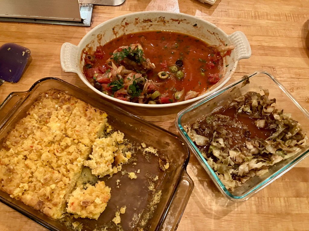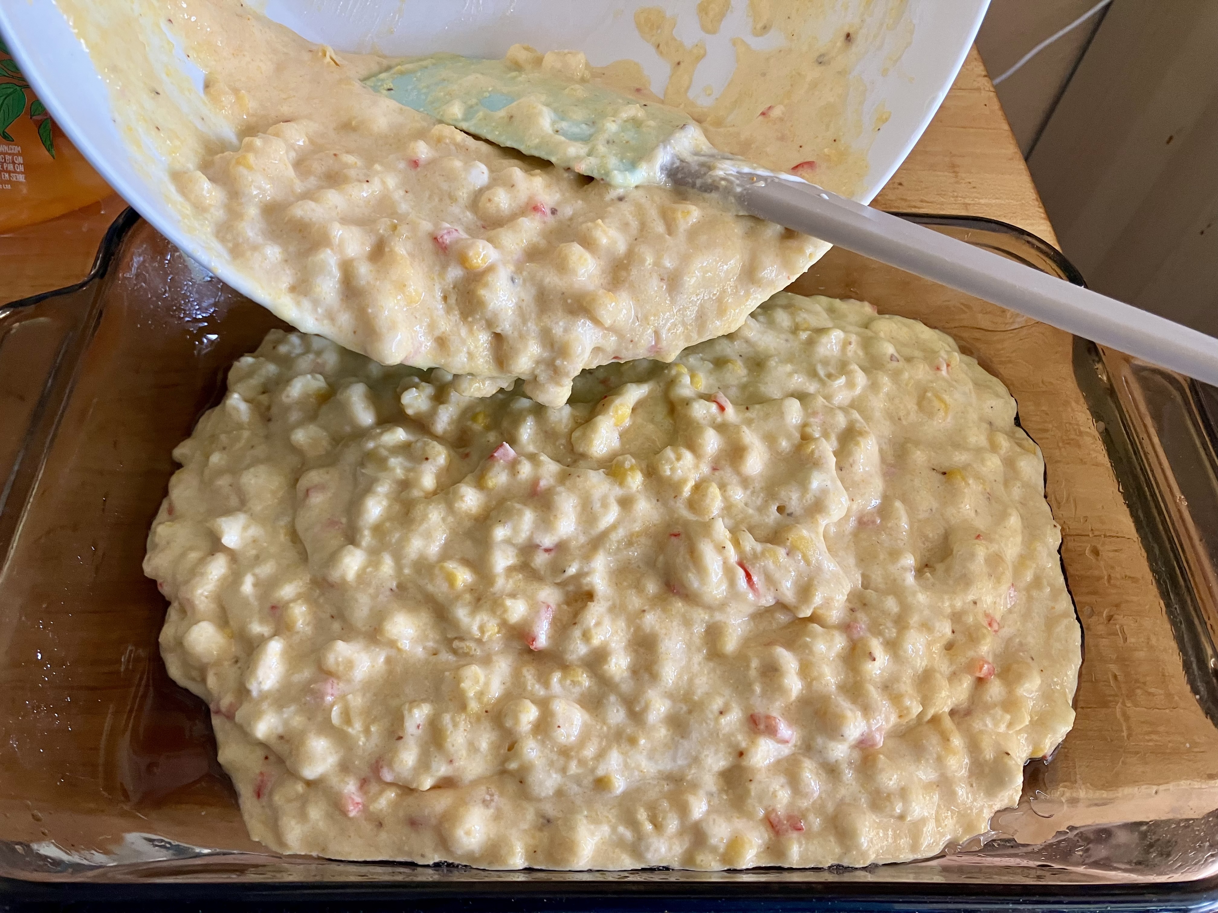 My Southern friend Dennis, raised on this not-quite cornbread-not-quite-pudding-not-quite spoon-bread recipe, finally got me to make his sister’s treasured version. I’m VERY glad he got this Northern friend to make it. My dinner party also thanks him!