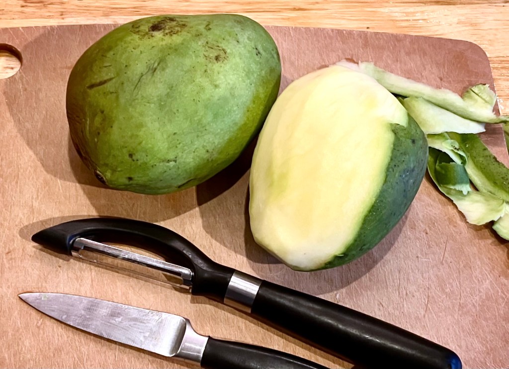 * I created this recipe for all of us mango growers who have too many green mangoes. Now we can freeze some of the ripe ones and combine with our plenitude of green ones to create a sauce that is right up there with applesauce.