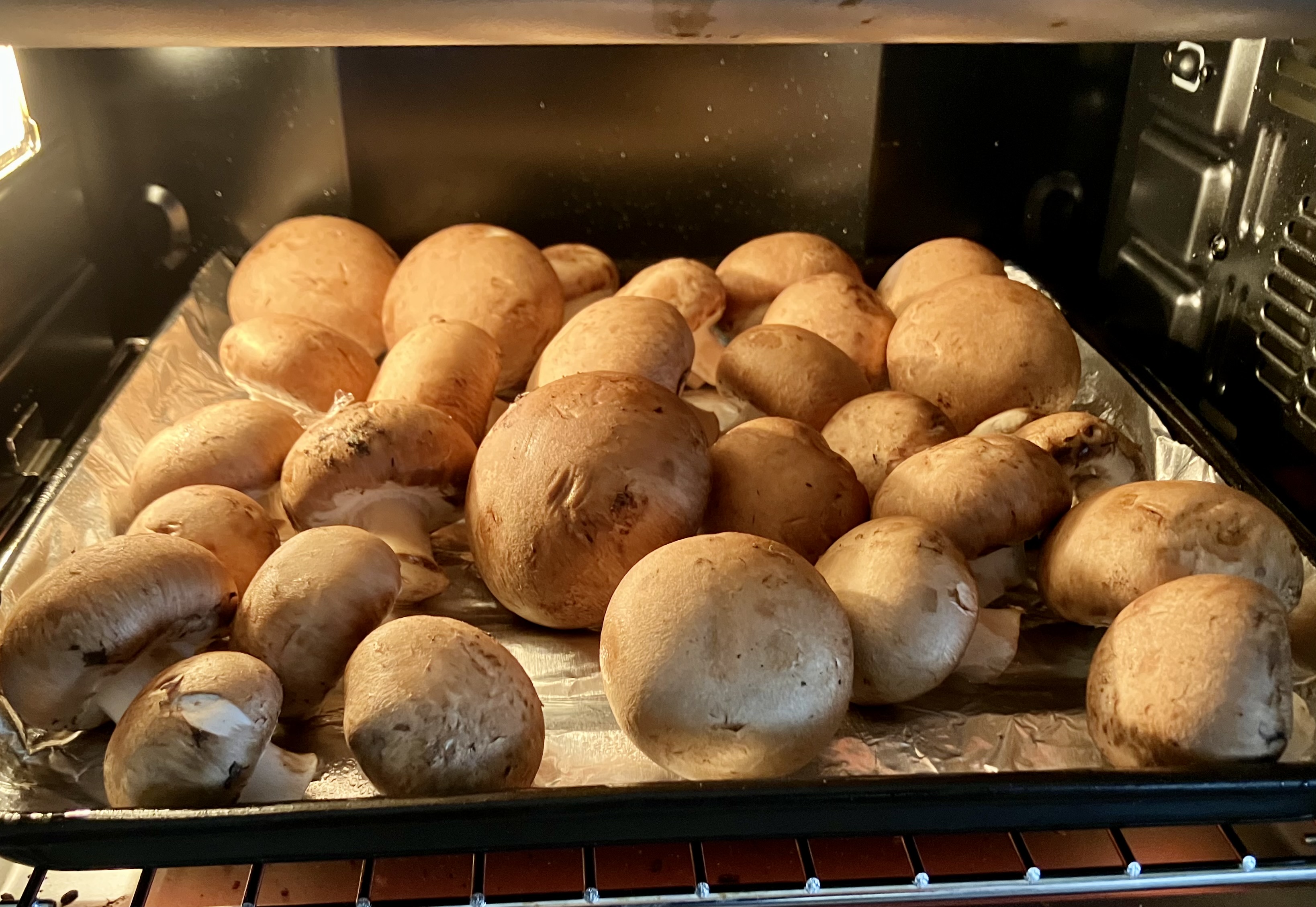 Use a sheet of foil on a baking sheet: spray with oil and space mushroom caps evenly about the sheet; then spray caps with oil