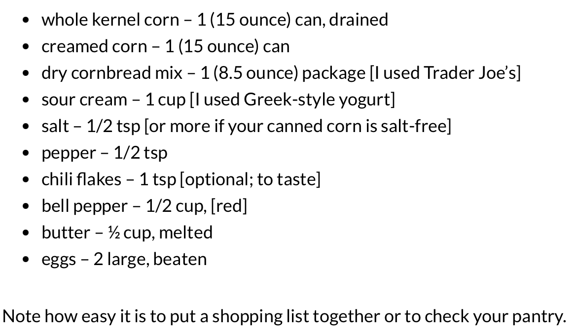 Note how easy it is to put a shopping list together or to check your pantry. Like anything new, it takes a little getting used to, but trust me, when comparing with current recipe formatting, it helps make cooking easier.