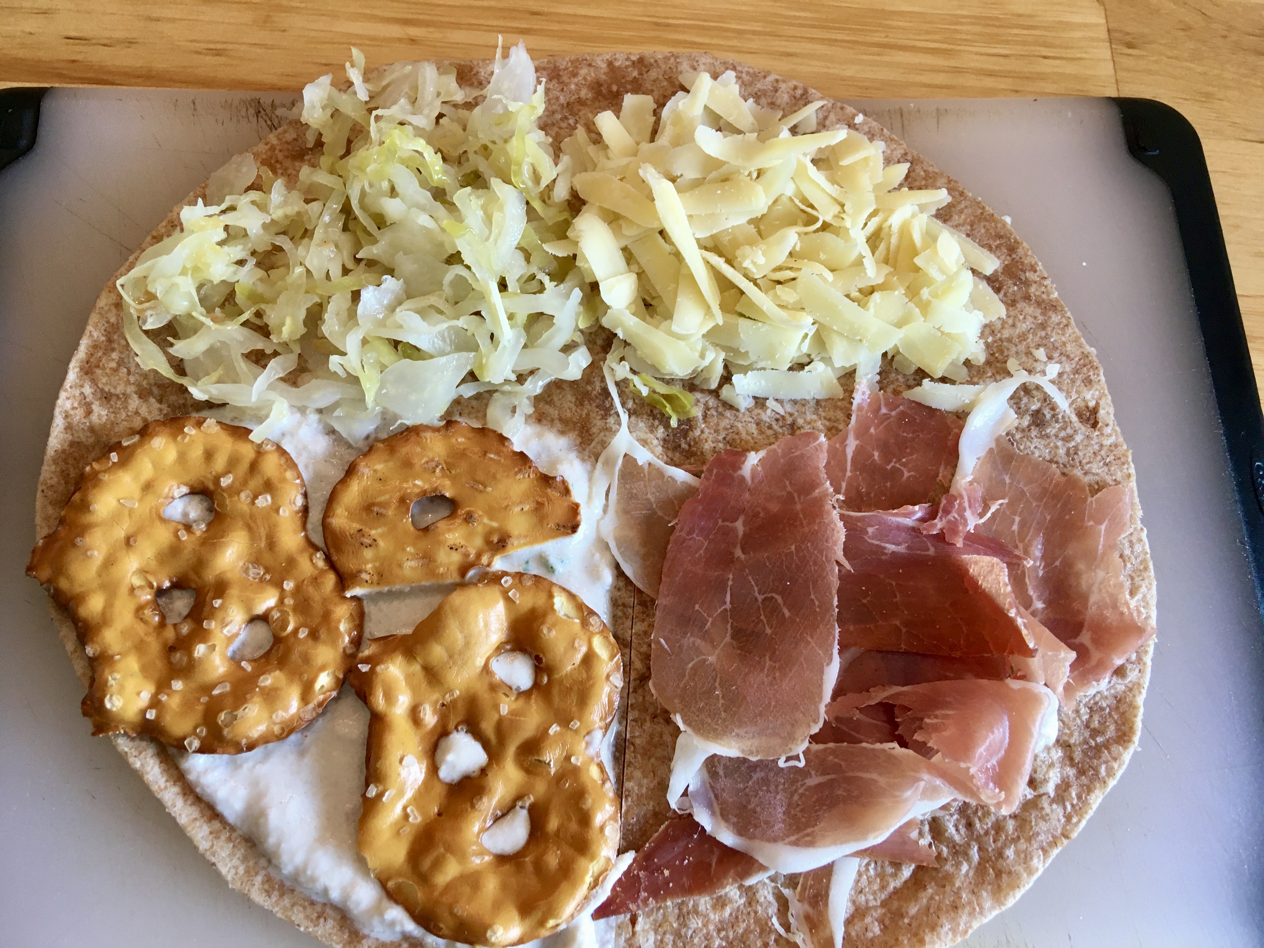 This is a Kinda Rubenesque Quesadilla: Horseradish sauce and Pretzels, Then Sauerkraut, Then Swiss Cheese, and Finally Prosciutto Ham