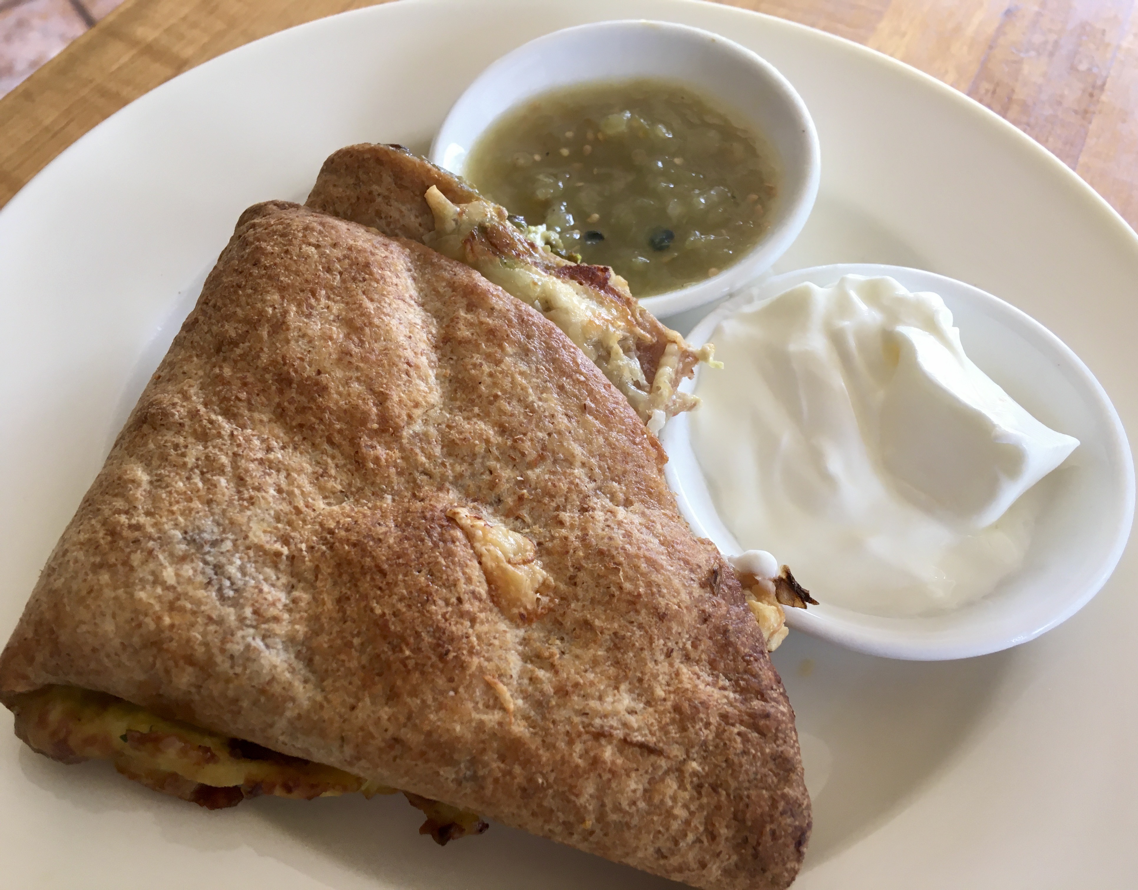 Creating a folded quesadilla is so clever. Slice one radius cut in a large flour tortilla, and then plan on adding a variety of ingredients in the imaginary four quarters. Then carefully fold to create a folded quesadilla.