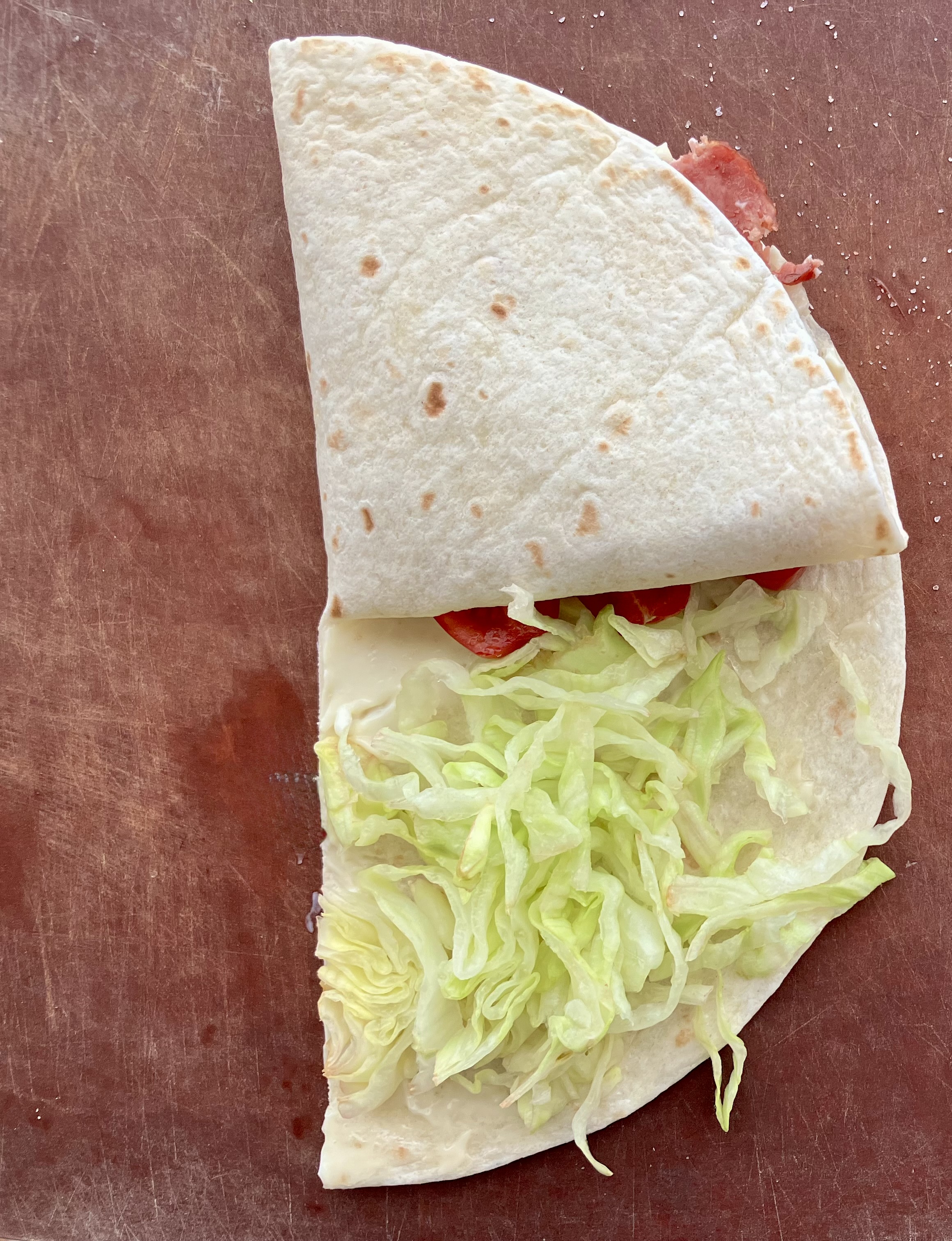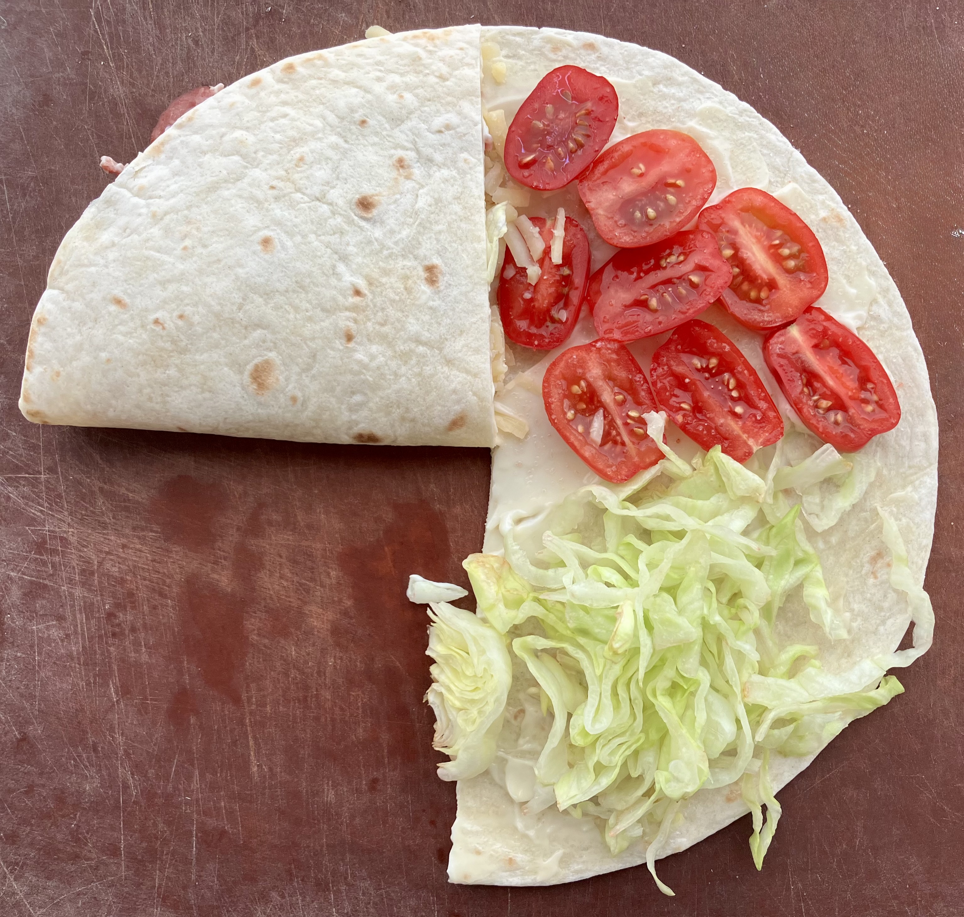 The ingredients should be drained, and the first quadrant should have something easy to fold [don’t have minced ingredients in the first quadrant, [see above]; Plan on the protein to be in the first quadrant, so you can start the fold and the ingredients will stay in position as it gets flipped over.