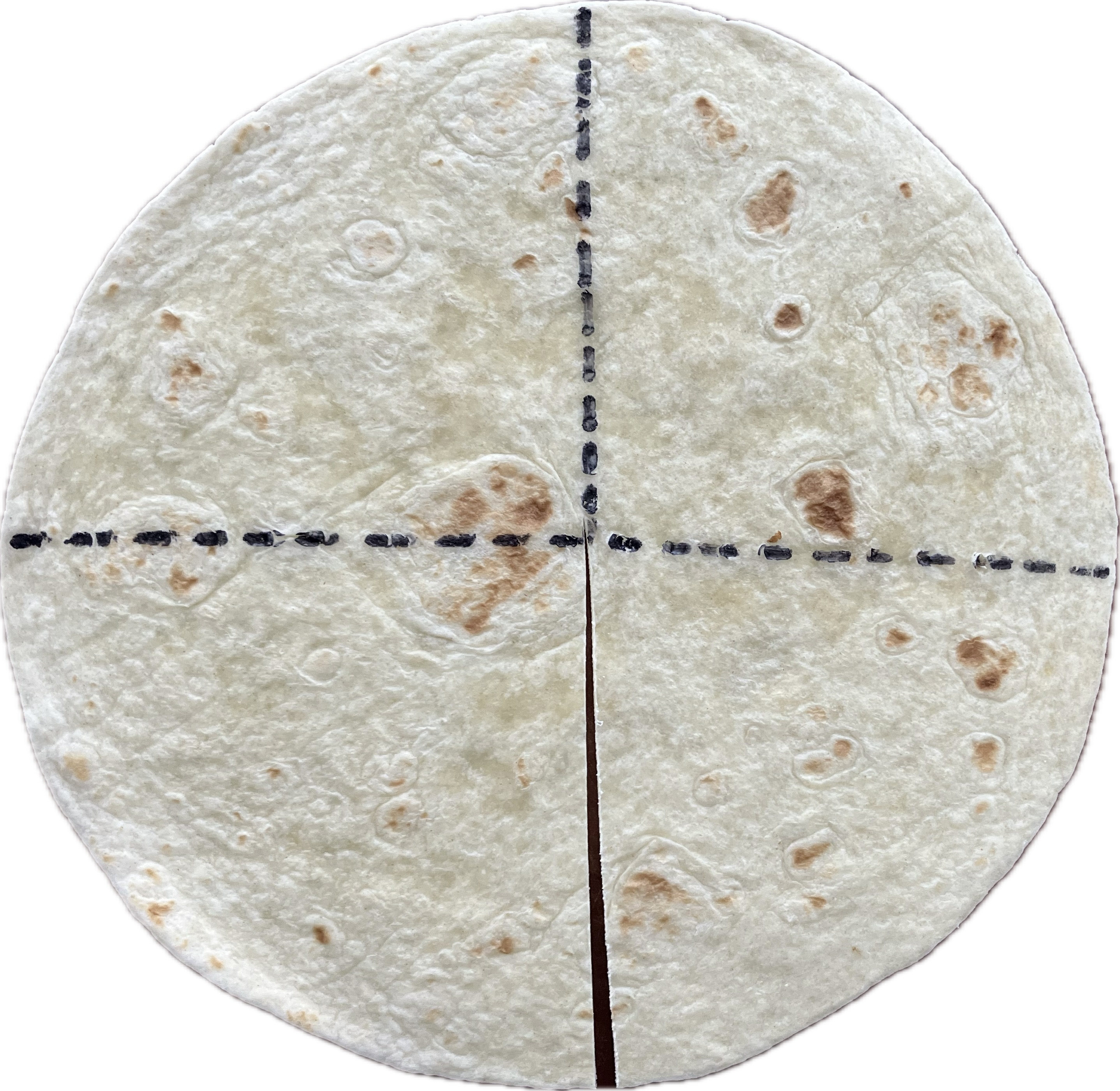 Note: Use a knife and cut one radius [above—the solid line]. Note the hash lines: these are imaginary to guide you to adding the four quadrants of ingredients. Leave a little space at those lines so it will fold easily. Once filling all four quadrants, the folding starts with lifting the lower left quadrant onto the upper left quadrant, then fold again onto the upper right quadrant, and finally fold over the lower right quadrant.
