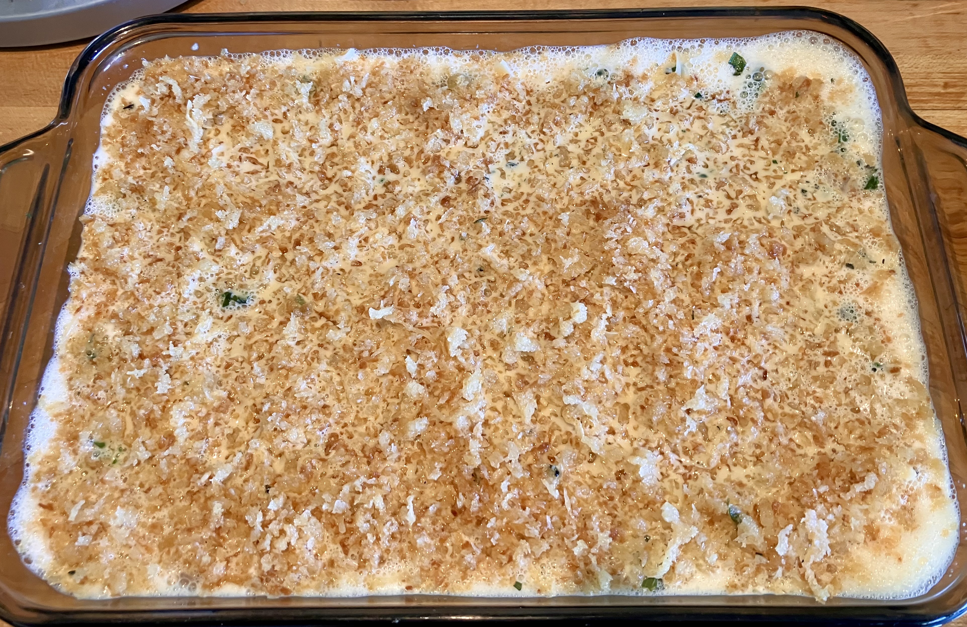 5. Oil a baking dish and pour in the quiche mixture then top with the panko-parmesan mixture