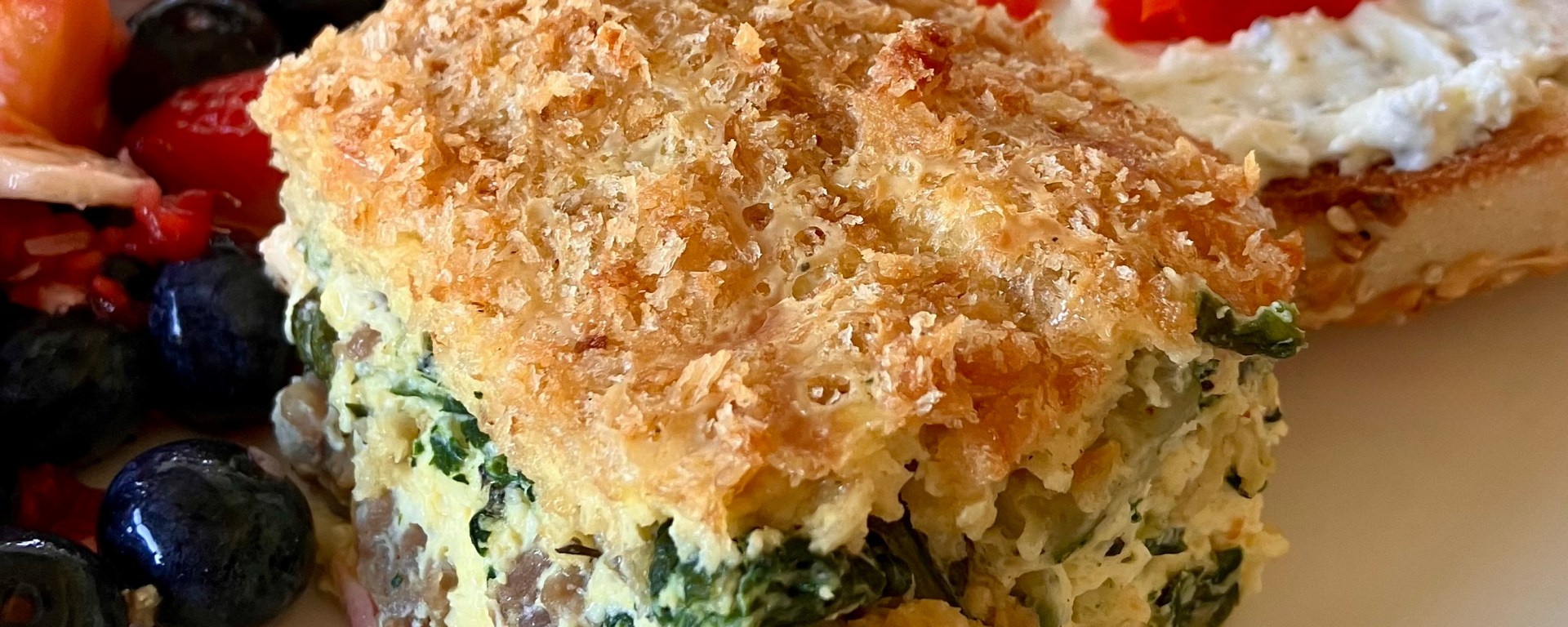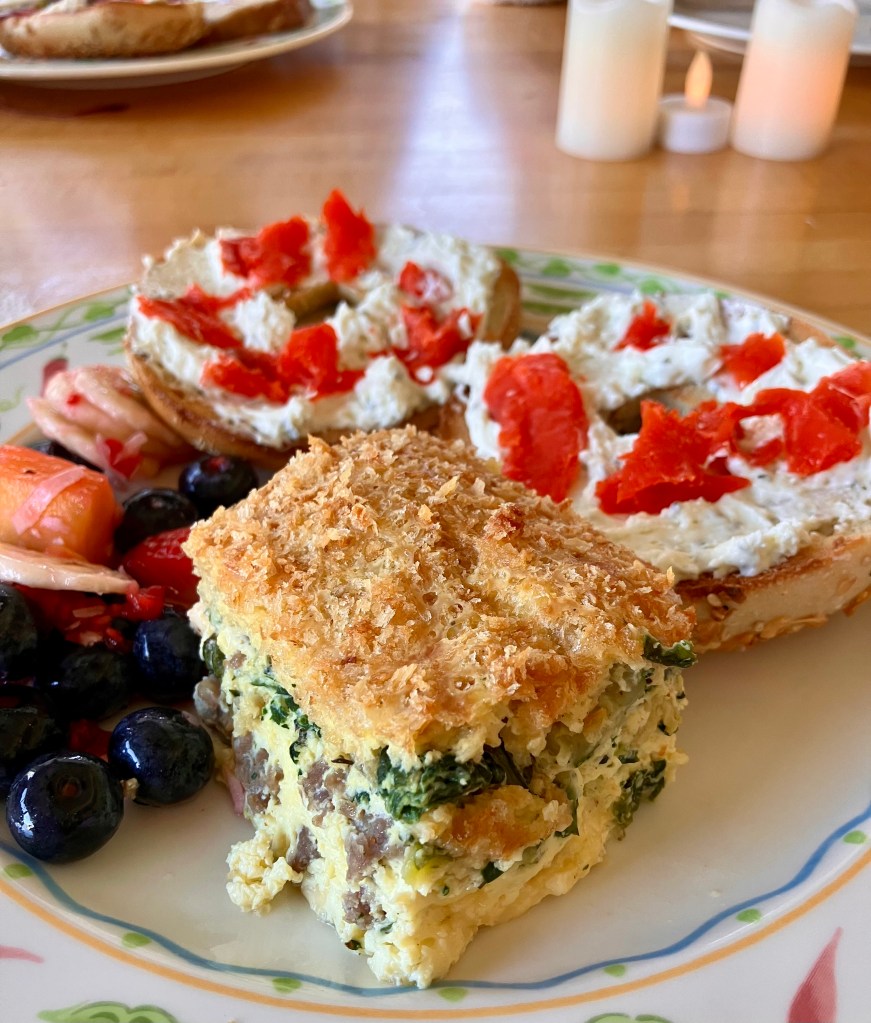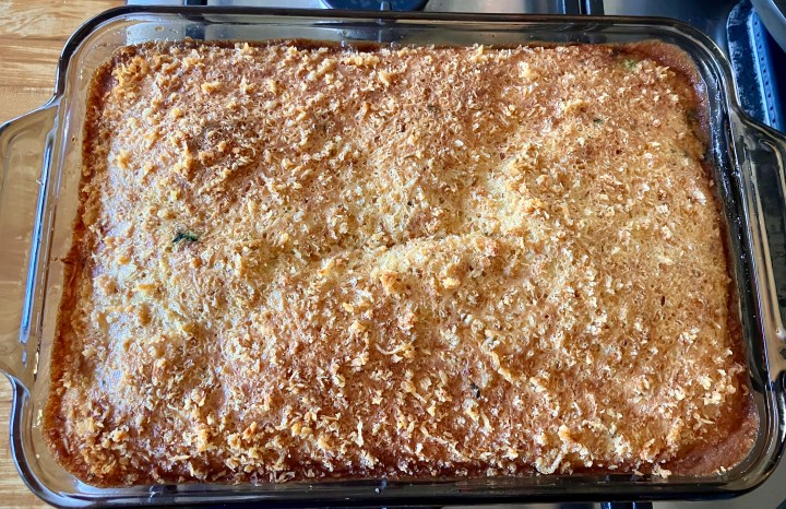 1. The casserole pictured above includes some leftover pesto I had saved as “ice cubes.” That’s why the green hue. Very tasty BTW