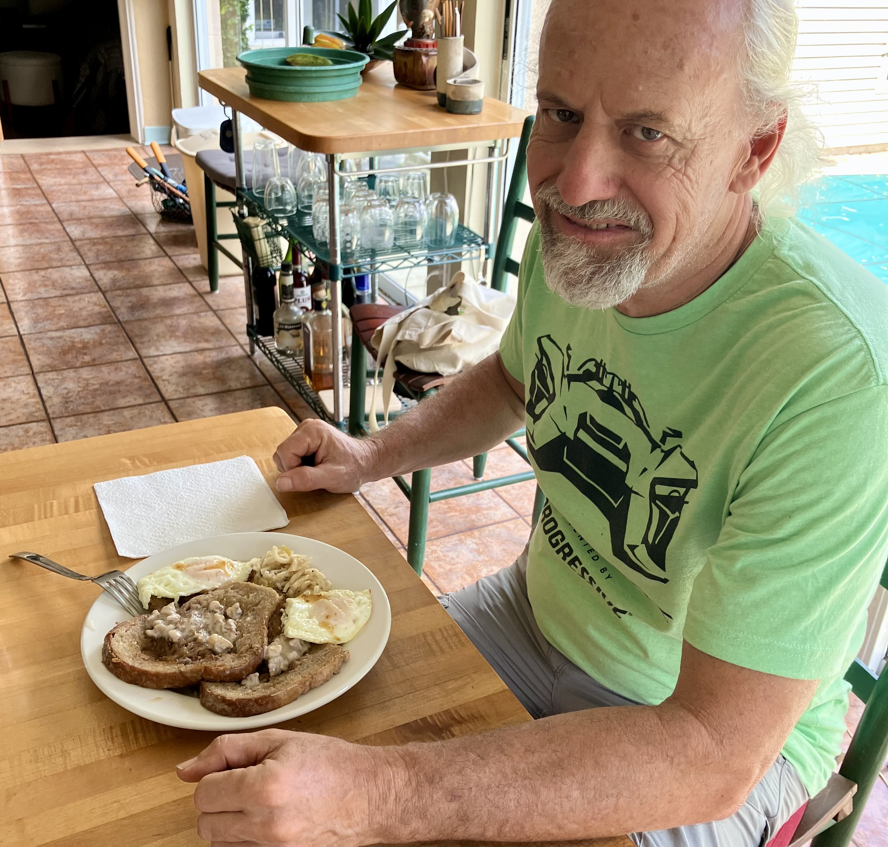 Lowell, ready to dig in, along with fried eggs and froot chutney